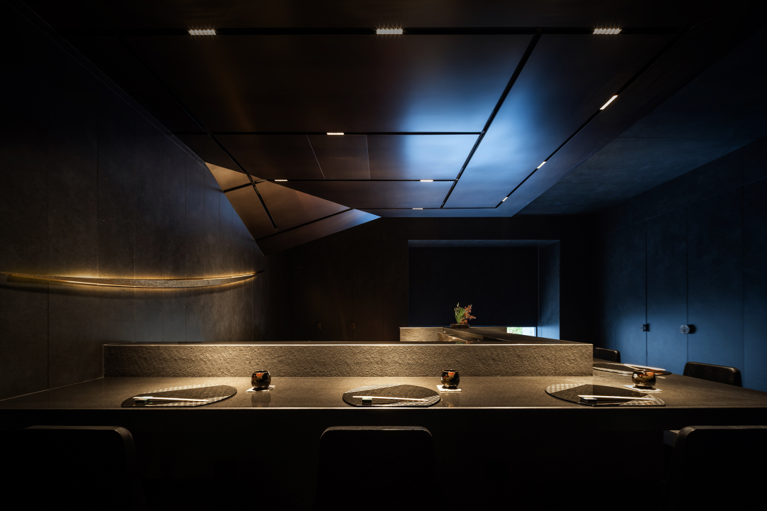 食物与空间互通有无,是 烧鸟omakase 的精髓。设计师采用明暗对比的手法,将视觉焦点引向板前区域,色、声、味、光和影,任凭感官与内在察觉交织更替,沉浸游走于其间,使客人不经意间投入料理的手作过程中。