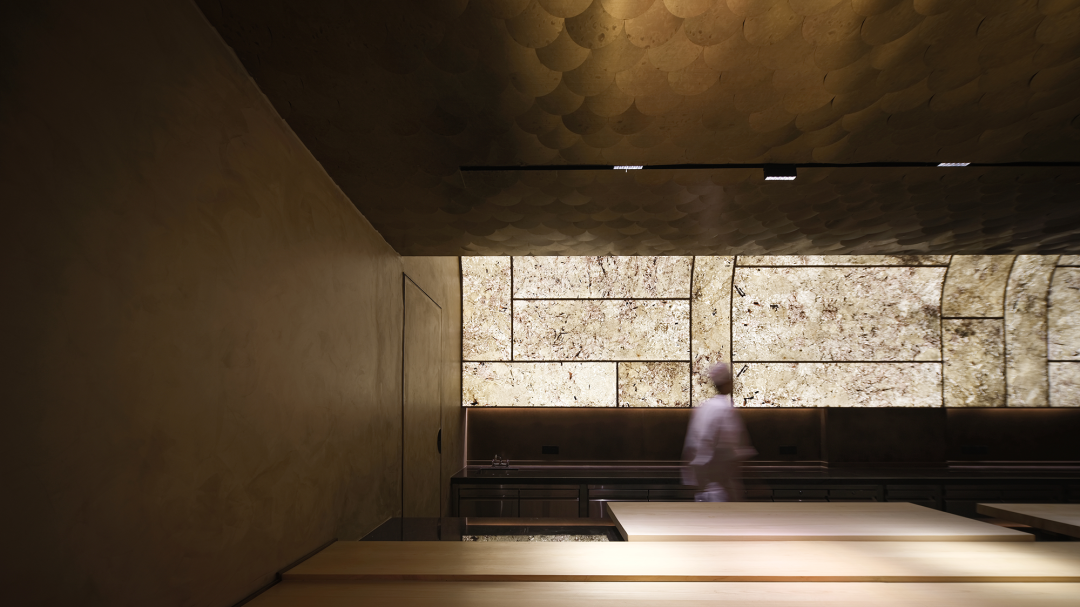 天顶弧面的造型覆盖了整个空间,以圆润的线条构建形似鱼鳞的块面规律的阵列形成了天顶,纹理细腻且极富韵律感的彩色鳞片表面,带来雕塑般的立体观感,贴合日料性质的同时又不失空间概念中的柔和。