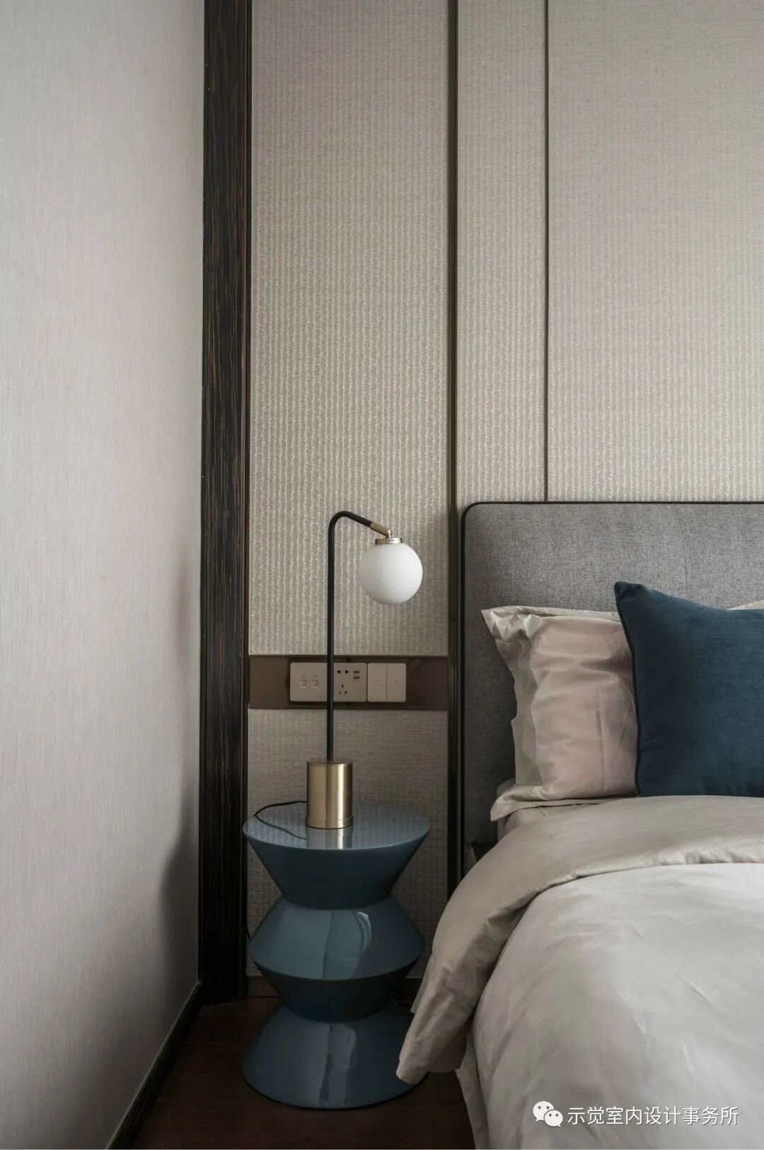 设计师形容,改造后的主卧,呈现的是一种安静柔和的氛围。 床的设计感体现在了旁边的床框上,床框是与整个空间相协调的实木木色,与硬装框架灰色性相呼应,通过床头柜设计来做点缀,定制斗柜加妆台一体的结合,满足收纳性功能,在空间格局上打破了常规的空间功能性区分,在解决功能性的同时,使得空间可以得到最大化利用,空间更加开敞明亮。 床头柜选择有设计感 轻巧的款式,点缀设计款轻巧台灯、金属底座与内嵌金属线条的背景墙相呼应,显得简约轻巧安静,不失品质的融入,空间的轻奢感立现,晚间光线的温柔,催人入梦。