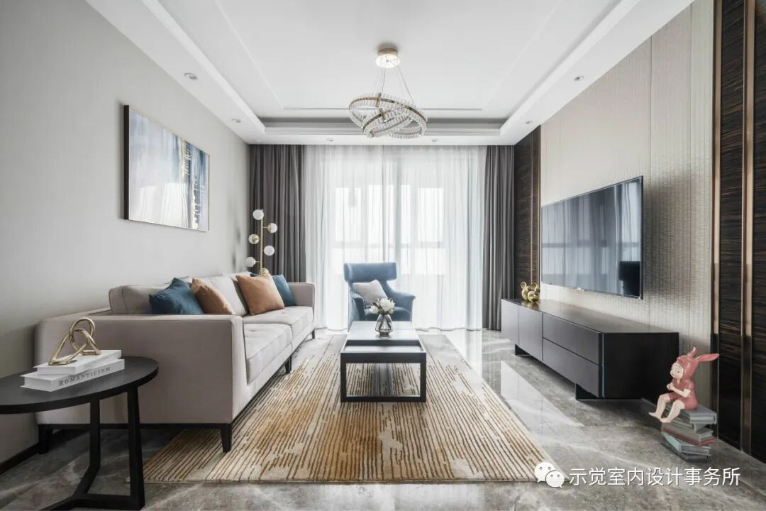 设计师从整体空间考虑将L型沙发换成了通透大气的三人沙发,视觉上也更舒适的沙发,增加了空间感,空间的延展变化,自然而理性。