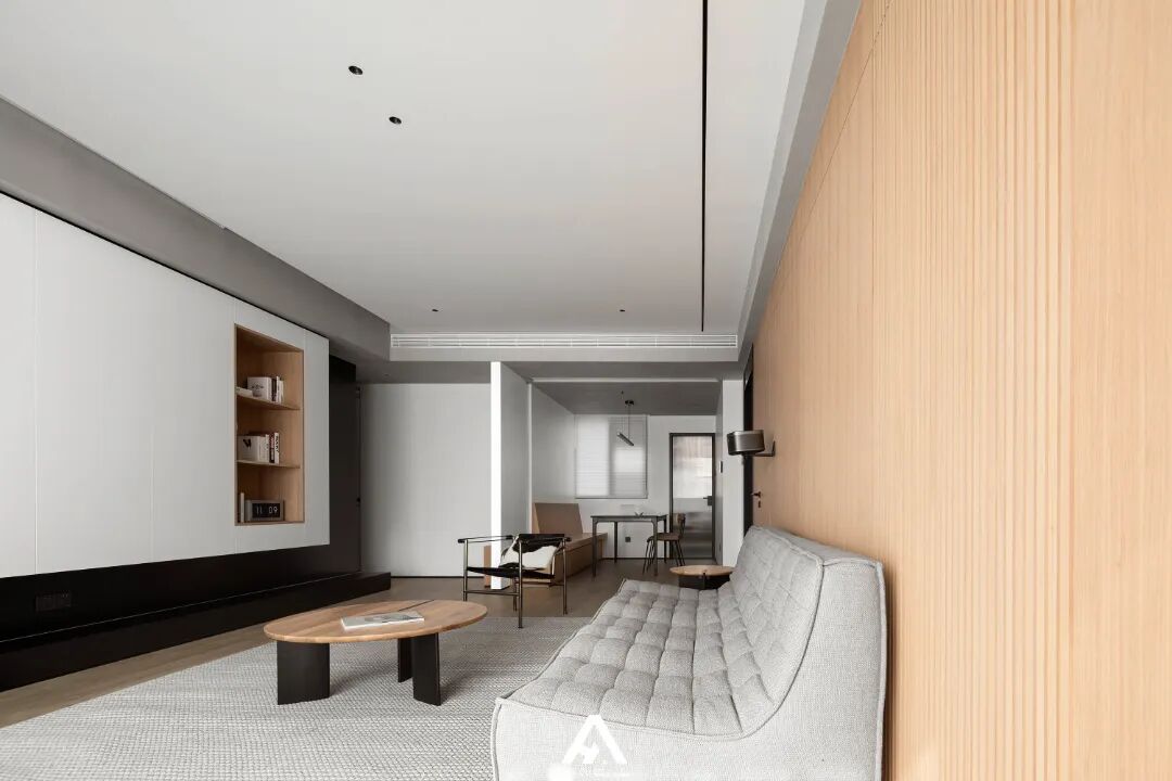 起居室做了去客厅化的设计 取消了传统电视的功能 增加投影 平时不用的时候可以收纳到吊顶上 电视背景设计了一组柜子,敞开的部分可以放置一些常看的书和摆件
