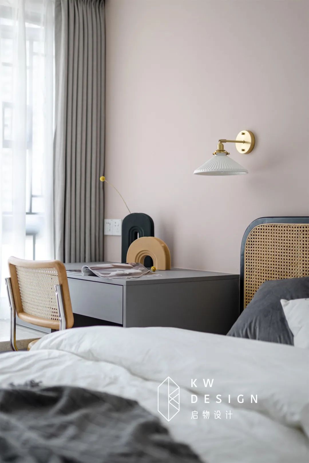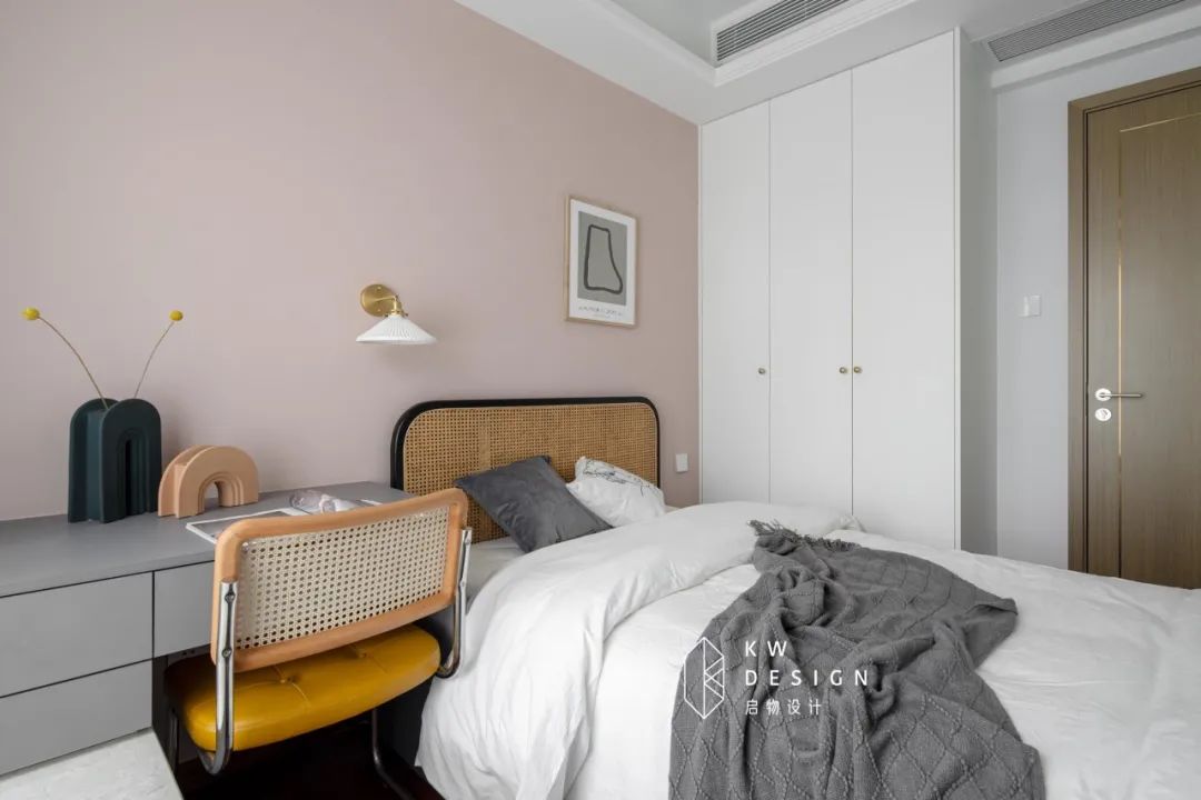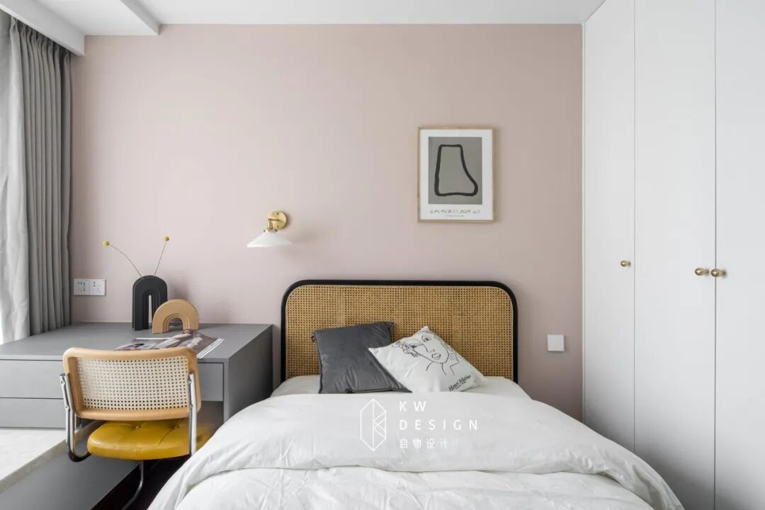 读服装设计的小女儿时尚个性,常常是一身黑、烟熏妆的酷酷打扮,却格外钟意粉色。所以我们主墙面采用了脏粉色。次卧的设计中,她还提出希望有一个大大的桌子可以满足做功课和游戏娱乐的需求。将书桌架到飘窗上,空间局促的情况下充分利用飘窗也是个巧办法。