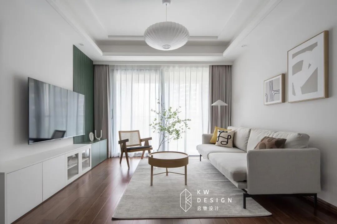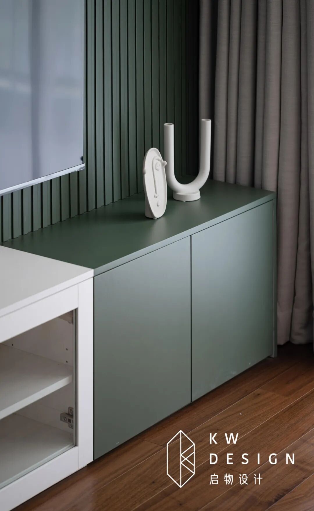 电视背景参考国外设计做了一半的墨绿色条纹护墙板,随心情更换一些简单的艺术摆件,轻松打造一个屋主品味的展示小角落。小面积的墨绿色采用也丰富了客厅的色彩,维护深色和浅色的平衡。