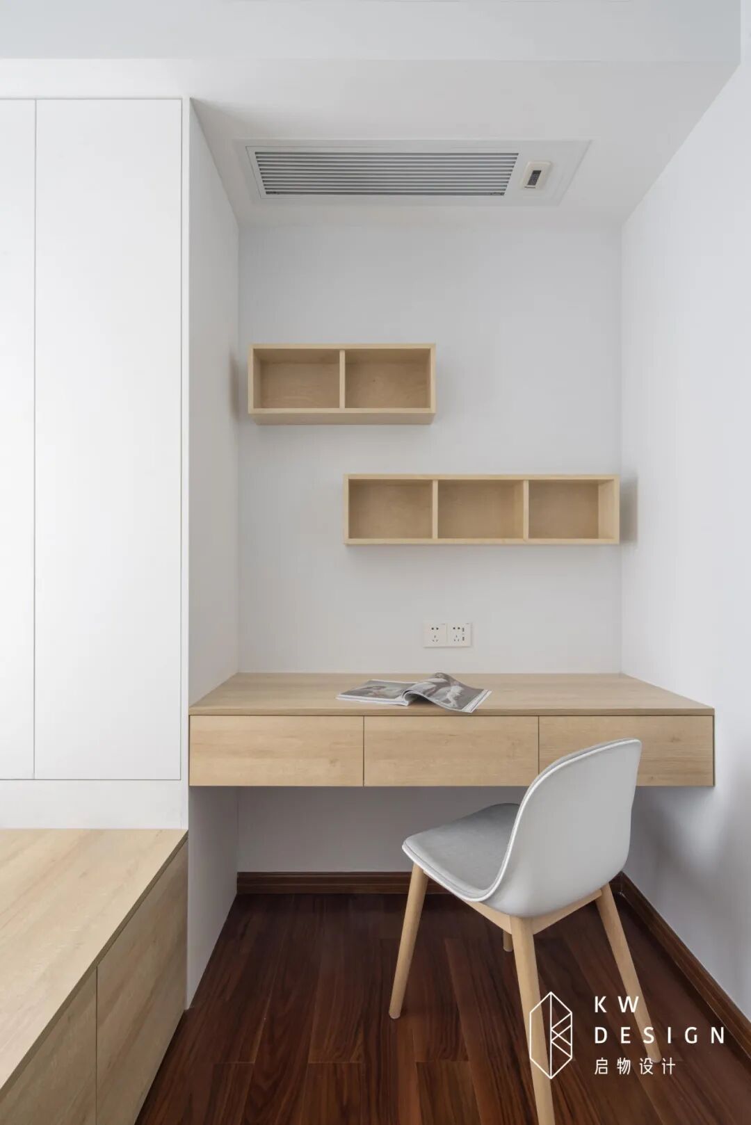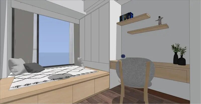 因为只是度假来住所以衣柜不用太大,利用飘窗做了一组展示柜,屋主大女儿希望能用来安置她钟意的一些装饰物件和书籍。