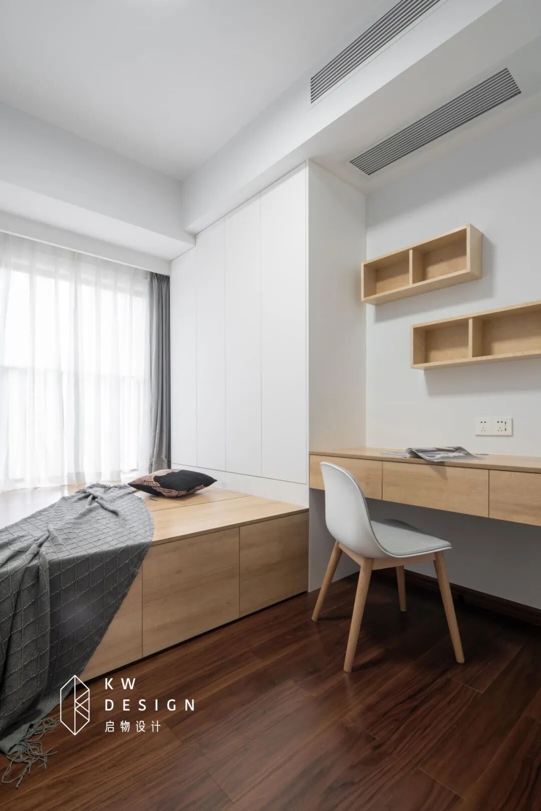 多功能房打造了一个榻榻米,是余姐和老公偶尔来住,大面积原木色和白色的采用,使房间简约明亮、充满温润质感。充分利用飘窗空间,将床和柜子架到飘窗上。房间收纳功能满分:半面墙的柜子、榻榻米的抽屉、书桌、开放格均具收纳功能。