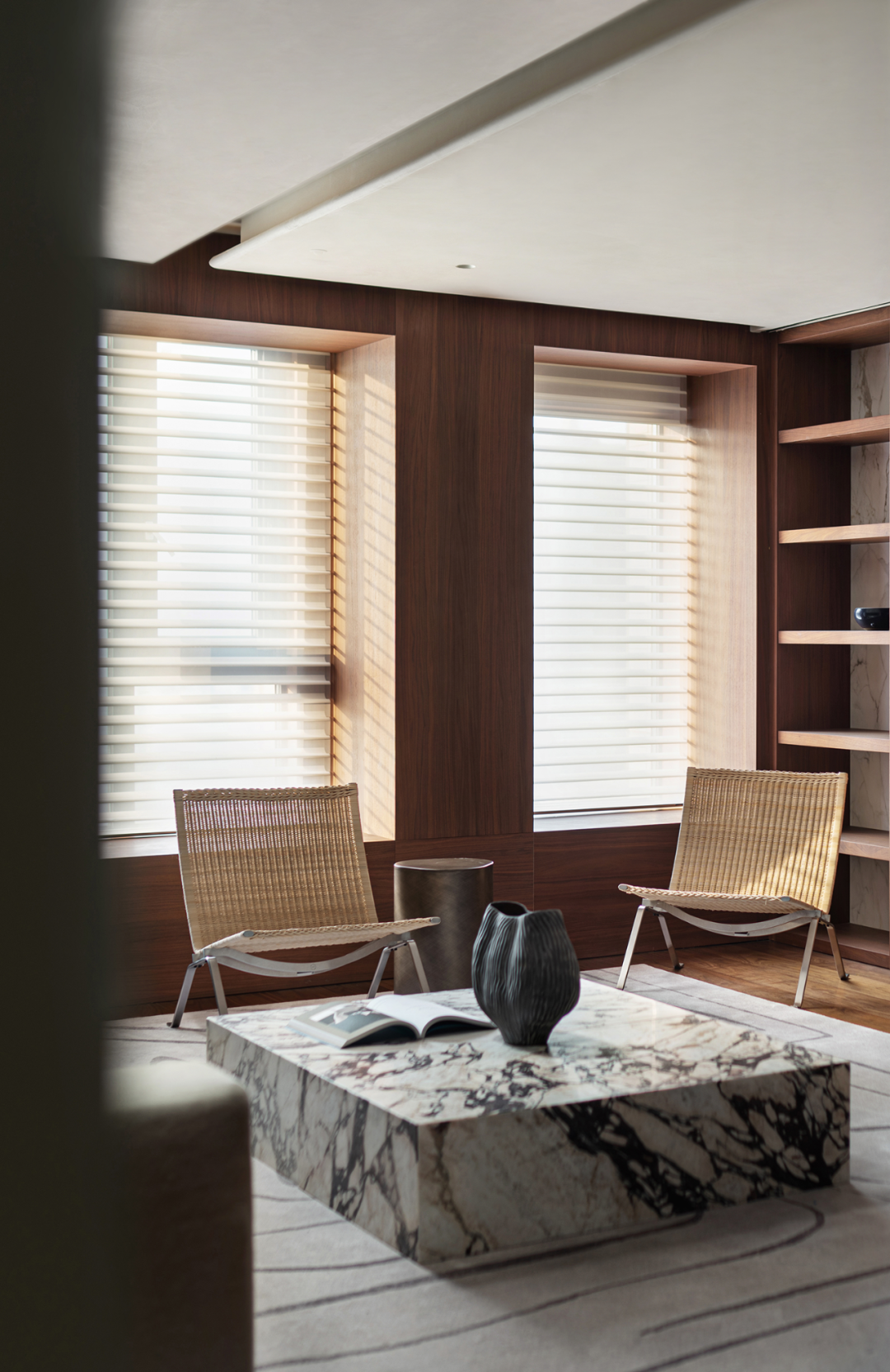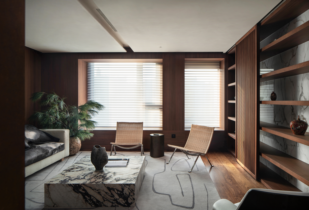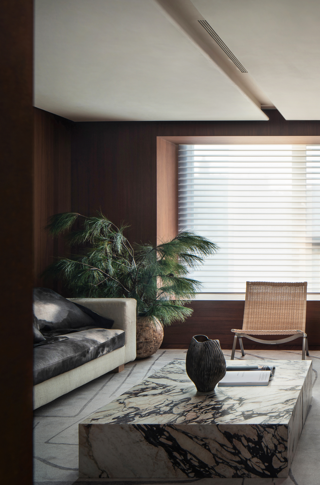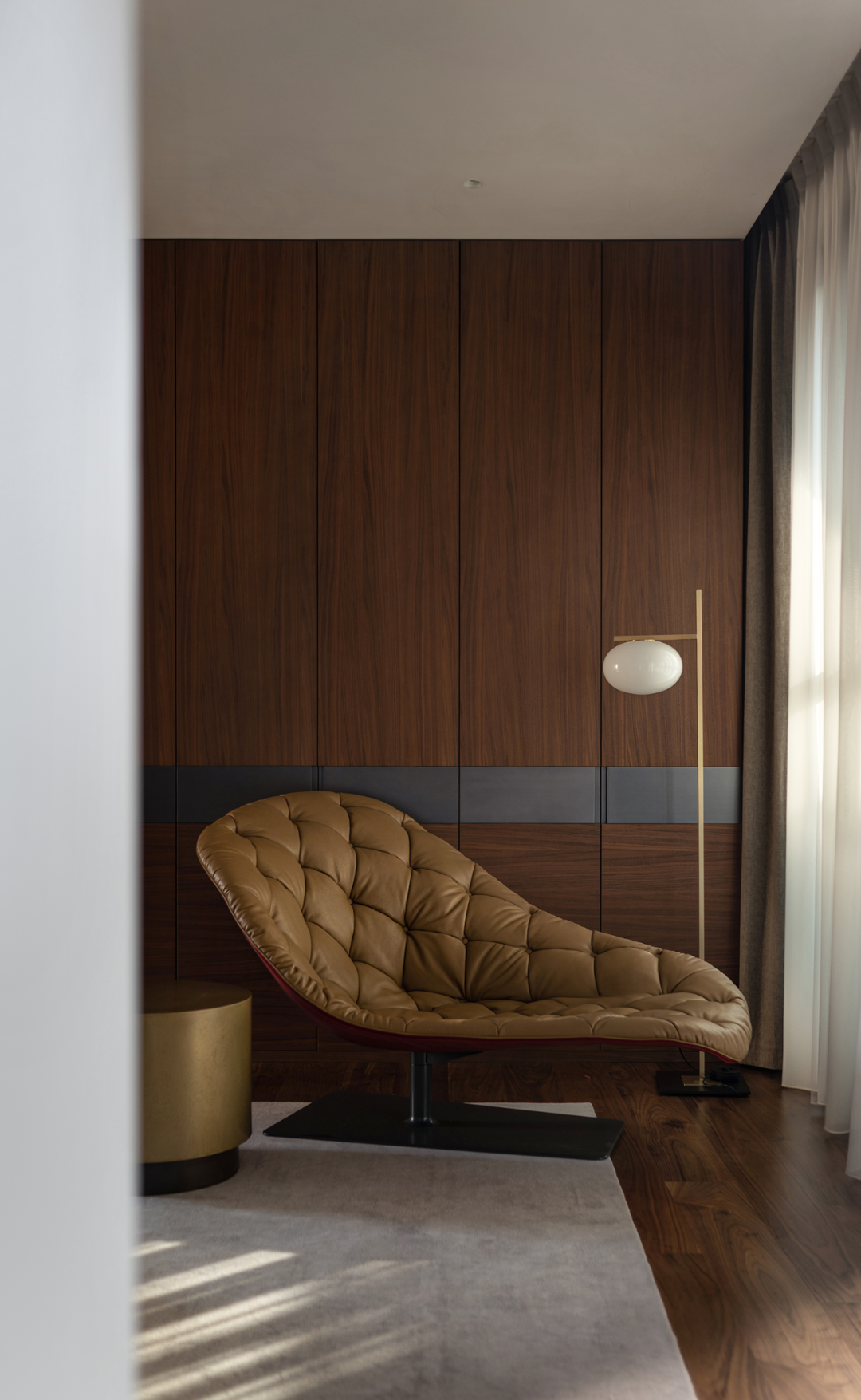 这也是一个逃离都市喧嚣的出口,在这里,居住者在繁华之中也能感受到徜徉大自然般的宁静。先前偶然地知晓“森林浴”这个新鲜的词汇,这一次,设计师想把这种奇妙治愈的感受融入到的朝夕相处的家居空间之中。